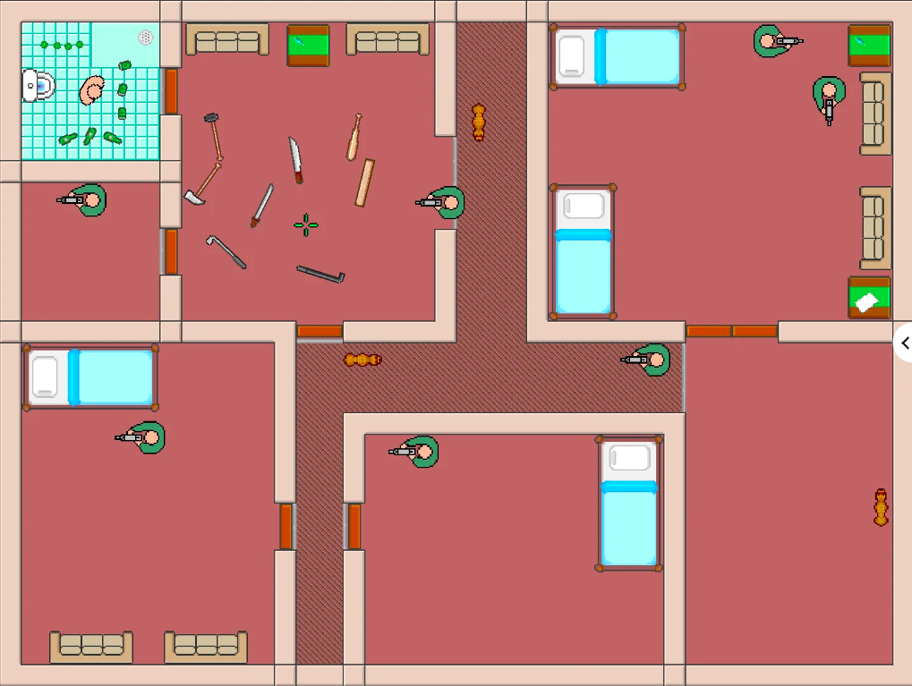 The demo, called Super Carnage, featured a single room, a handful of roaming enemies, and a player character who could move through the space, pick-up/use melee weapons, throw small objects, and summon a machine gun to shoot with.