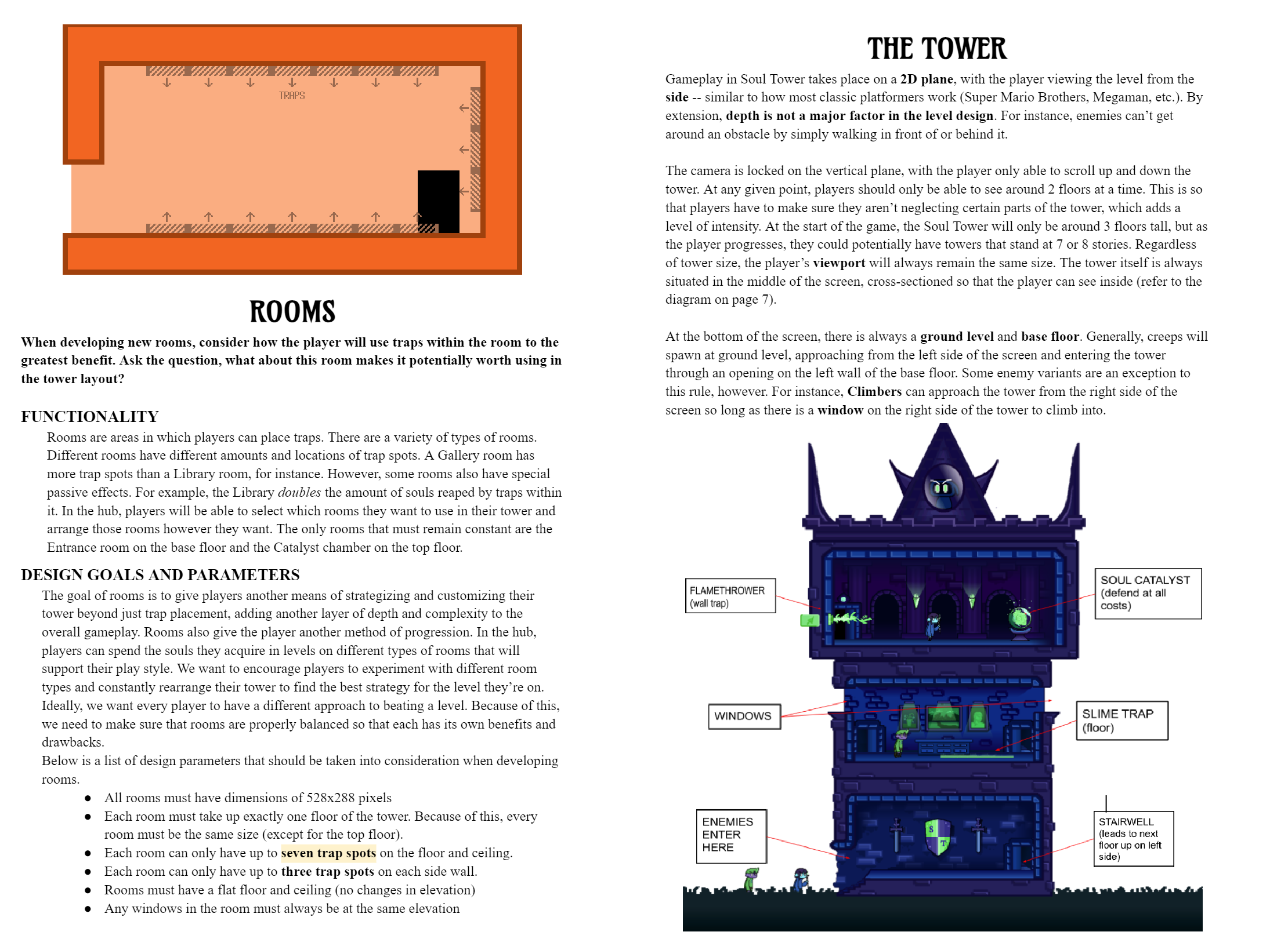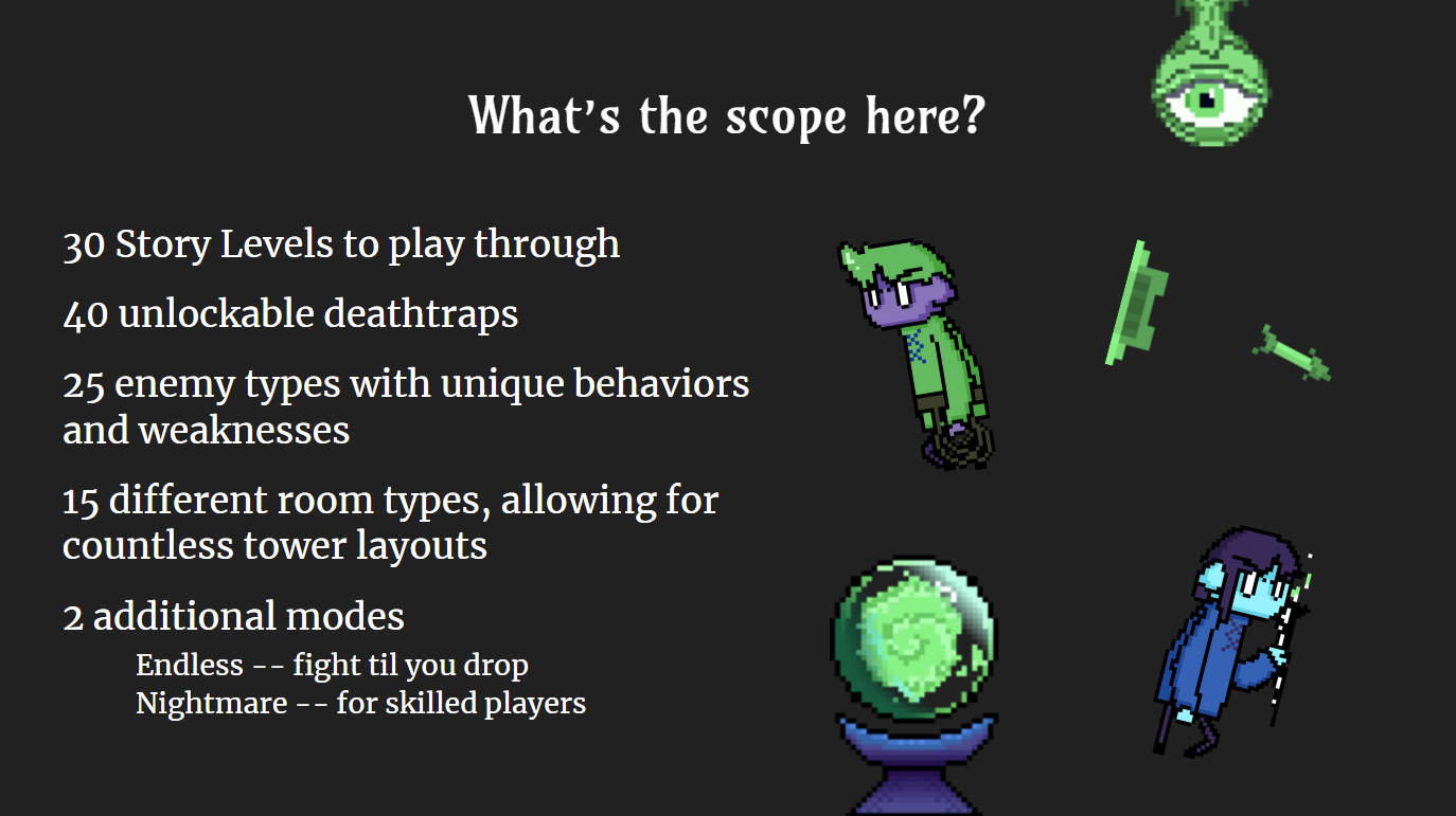 As the project evolved, I steadily replaced temp assets with completed sprites by our lead artist. In addition, my programming partner and I utilized GameMaker's object parenting system to optimize implementation of new traps, rooms, and enemies. This made it far easier to add and iterate content in our demo up to its completion.